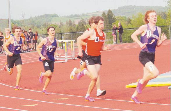 Waterville High School and the boys and girls outdoor track and field teams hosted the Center State Conference Division III track meet last week. Twelve schools came to compete with the Indians for league championships. Logan Baker, out front as the one-milers round the third turn, Danny Casatelli and Connor Stanton earned points for Waterville with their finish. JP Hafelin wraps up his triple jump. More photos, Page 6